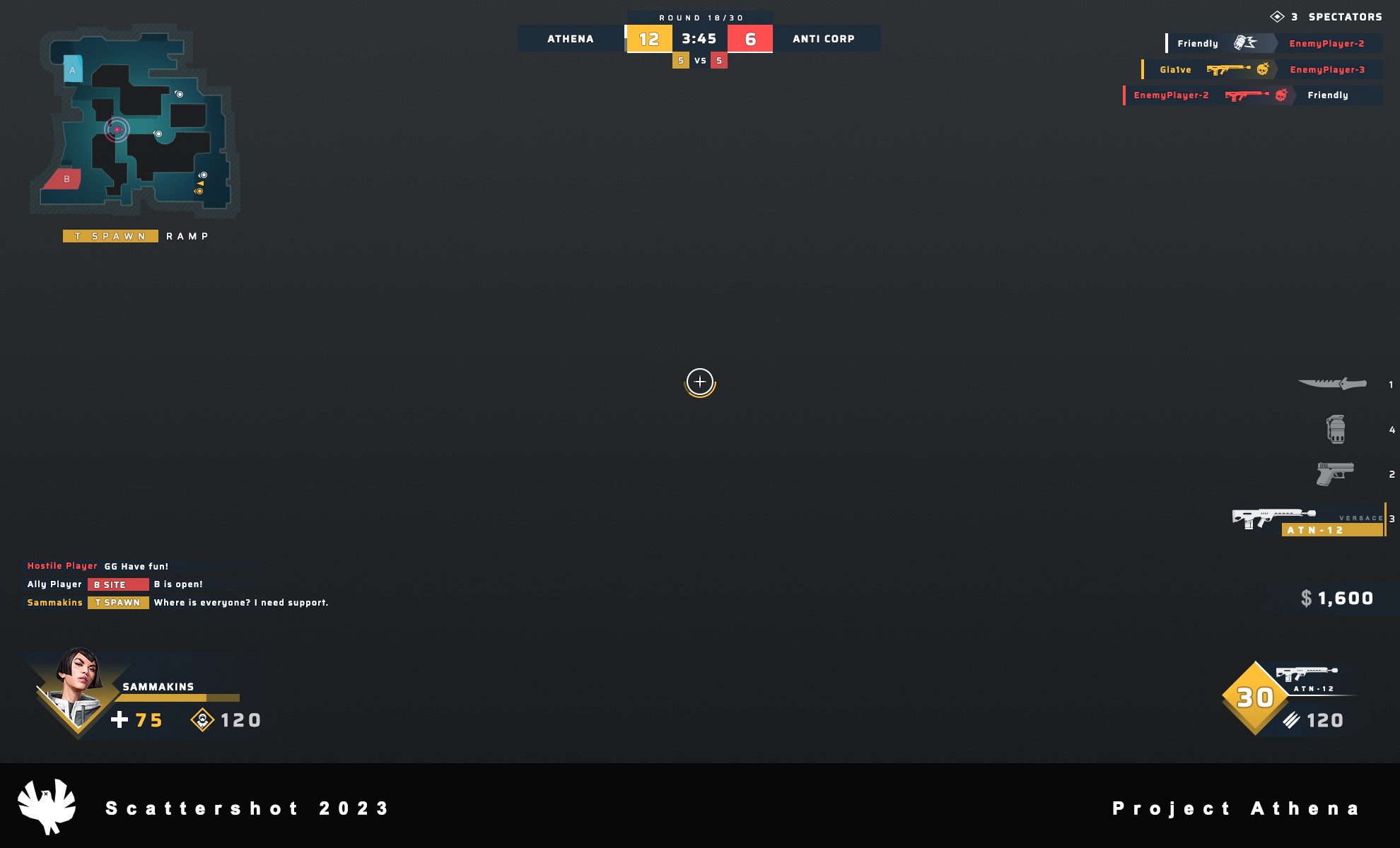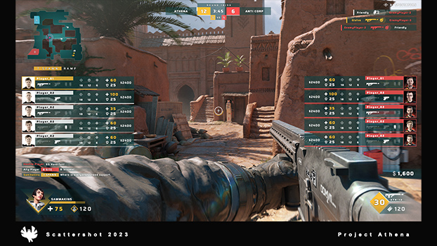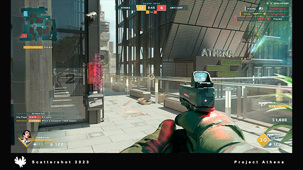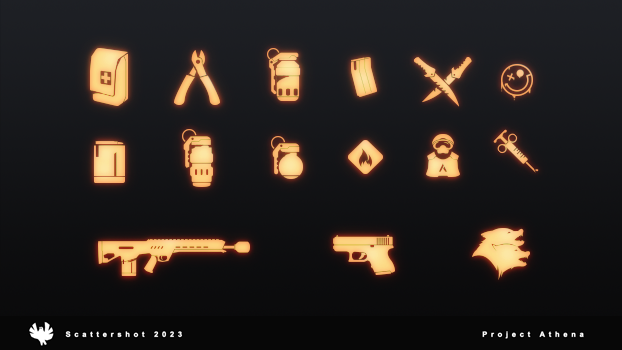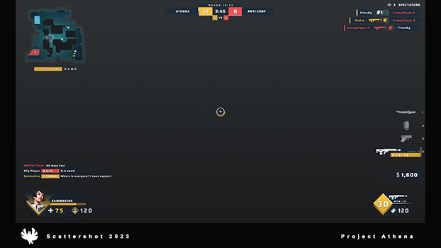In 2022, I was parachuted in to provide some exploration work on the HUD for Scattershot Games' upcoming competetive shooter, Athena. Images owned by Scattershot Games.